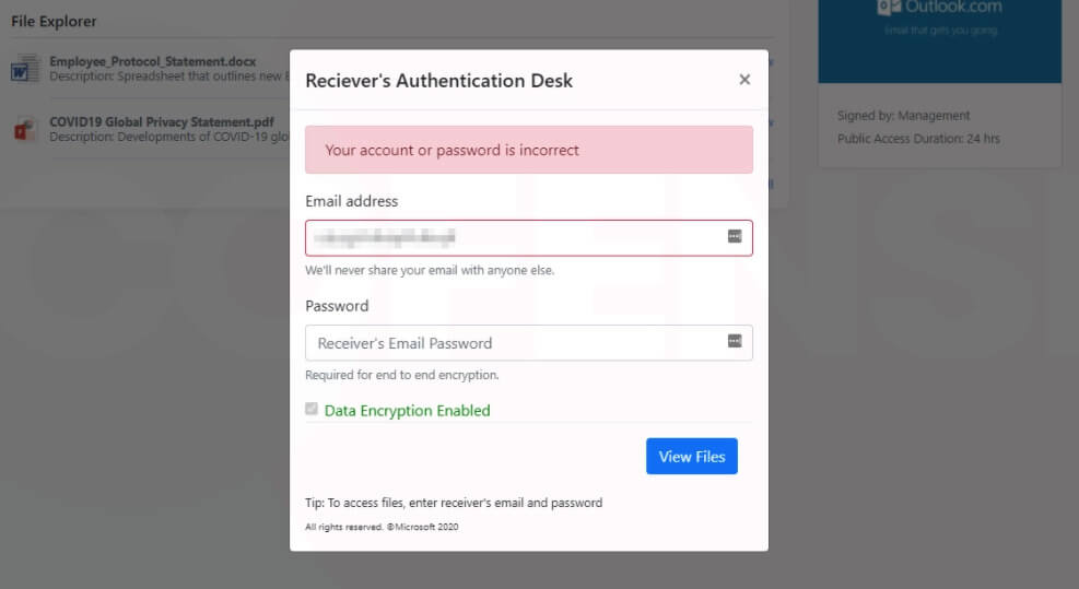 Clicking on either of the documents produces a login panel that prompts the recipient to provide login credentials to access the files. This is uncommon among most Microsoft phishing pages where the tactic of spoofing the Microsoft login screen opens an authenticator panel. By giving the files the appearance of being real and not redirecting to another login page, the user may be more likely to supply their credentials in order to view the updates.